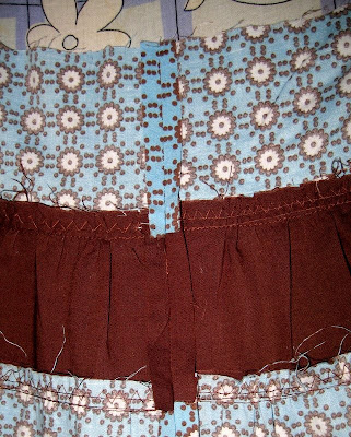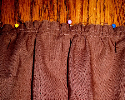 Hold onto the top strings and pull the fabric the opposite direction to ruffle. Do this on both sides until it's even throughout.